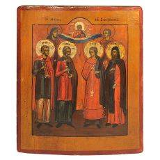 Гурий, Самон, Авив, мученики с предстоящими святыми Мироном, Вонифатием, Моисеем. Икона писаная 26х30,5 см, без ковчега, 19 век (Кж)