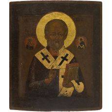 Николай Чудотворец, святитель. Икона писаная (Кзр) 26х31, золотой нимб, с ковчегом, частичная реставрация, 19 век