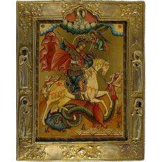 Георгий Победоносец, великомученик (Чудо о змие) с предстоящими. Икона писаная (Ан) 27х34, новое письмо на старой доске, открытая риза