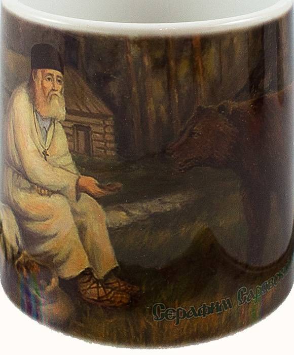 Чашка керамическая малая, с цветной сублимацией, объемом 180 мл, в картонной коробке, в ассортименте Преподобный Серафим Саровский кормит медведя
