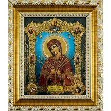 Икона в раме 9х11, полиграфия, конгревное золотое тиснение,зеленый фон, пластиковый багет, под стеклом Божией Матери икона Семистрельная