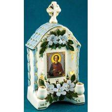 Киот фарфоровый настольный К- 7 Домик малый шатровый , с цветной росписью и золотом с иконой Святого великомученика Пантелеимона