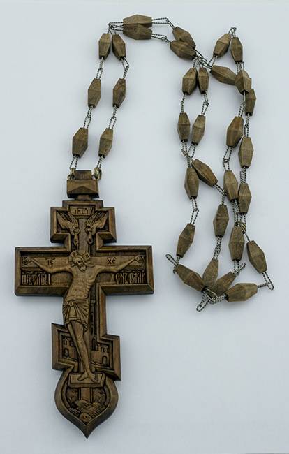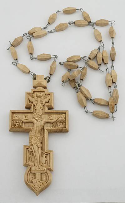 Наперсный крест священник носит на груди поверх рясы или фелони. Деревянные резные кресты относятся к крестам с украшениями. Звенья цепочки креста изготовлены из дерева и содинены между собой металлическими петельками. Часть цепочки скреплена и свисает на спину. Это символизирует двойное попечение пастыря о своём спасении и о спасении паствы. Данный крест изготовлен из ценных пород дерева с пропиткой. Он имеет восьмиконечную форму с куполообразной нижней частью. На лицевой стороне вырезано распятие, голова Адама, два плачущих ангела в верхней части креста, за распятием обозначена Иерусалимская стена, надписи объёмные. На оборотной стороне прорезан крест монограмма царя Константина и буквы Альфа и Омега. Изделие около суток пропитывается специальным составом, что повышает устойчивость дерева к воздействиям внешней среды и защищает от вредителей древесины.Все кресты изготовляются мастером индивидуально и могут иметь свои отличительные особенности.