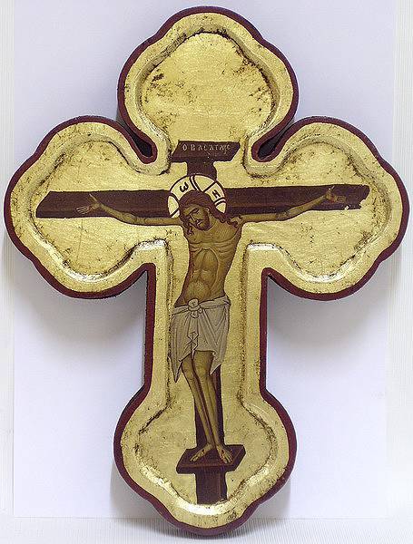 Крест изготовлен в Греции. Распятие - копия современной греческой иконы, написанной в классической византийской традиции, с использованием эффекта искусственного старения. Изображение нанесено на деревянную основу, старение имитируют трещины и патина. Нимб и фон позолочены поталью вручную, также вручную дописаны некоторые детали на иконе. На оборотной стороне креста есть кожаная петля.