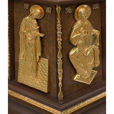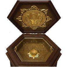 Мощевик - ковчег деревянный на 10 частиц, из дуба, с ажурными латунными позолоченными накладками и иконой Троицы, прямоугольный, высотой 21 см