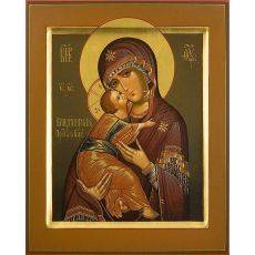 Владимирская икона Божией Матери. Икона писаная 21х25х3,8, цветной фон, золотые нимбы, с ковчегом (Шун)