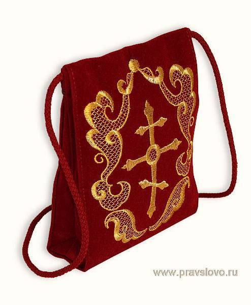 Сумка для дароносицы из замши на подкладке. Вышита метанитом золотого цвета. Застёжка «молния». Размер 18х15 см.