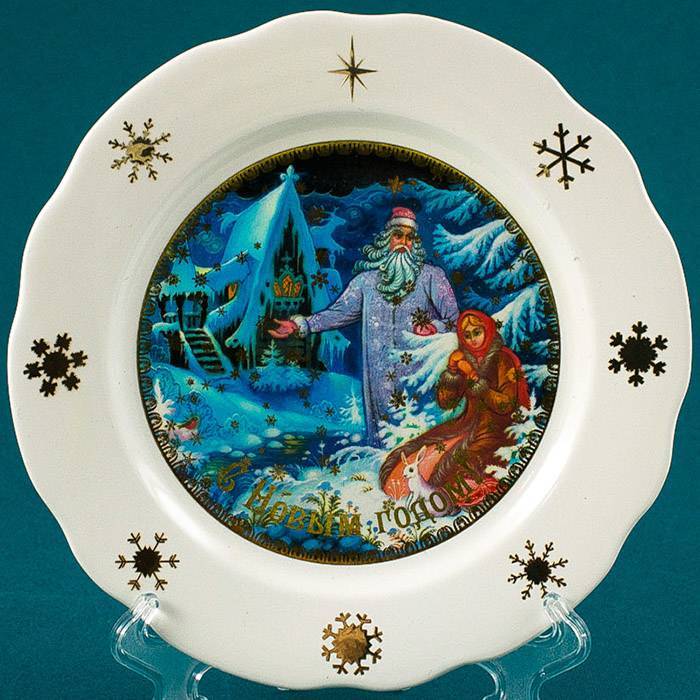 Тарелка фарфоровая рождественская и новогодняя, с литографией, с золотом, под лаком, с подставкой, диаметром 17 см, в картон. кор, в ассортим № 9 С Новым годом! Открытка. Дед Мороз и Снегурочка.