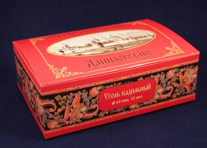 "Даниловский" кадильный древесный уголь, прессованный, в виде круглых таблеток, диаметром 60 мм. Таблетки угля сложены в столбики и завернуты в пергаментную бумагу, столбики упакованы в удобную картонную коробку. 12 шт.